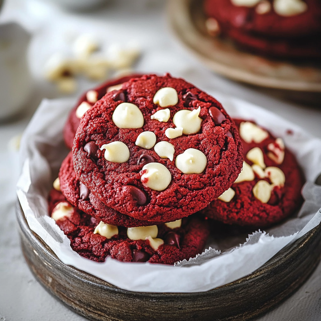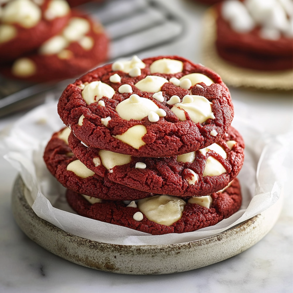 These cookies are more than just a feast for the eyes. They bring together the classic flavors of red velvet cake—light cocoa notes balanced with a hint of tanginess—paired with a creamy cheesecake filling and luscious white chocolate chips. The result? A cookie that’s soft, chewy, and utterly irresistible.