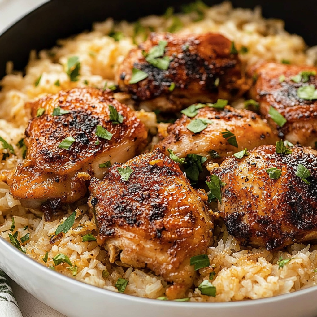 Place the seared chicken thighs on top of the rice and vegetable mixture. The chicken will rest on top, allowing the juices to drip down into the rice, adding flavor as it cooks. Don’t worry about stirring at this stage – the rice will absorb the flavors as the dish cooks.